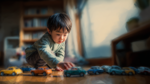 車のおもちゃ遊びの中でも、自分なりのルールや順序に強くこだわりながら遊ぶASDの子どもの様子を表現したイメージです。遊びを通じて見られる特性や行動パターンを、水彩風ポリゴンでやさしく描写しています。 サイズ:728 × […]