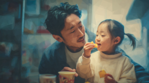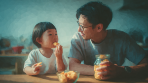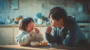 日本人の子どもが父親と一緒にキッチンでおやつを楽しむ様子。笑顔と会話のやり取りが楽しい雰囲気を作っています。 サイズ:728 × 408px解像度:72ppi生 成:Midjourney(Pro Plan)関連語:親子、 […]