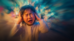 多くの人の話し声や物音が重なり合う雑踏の中で、感覚過敏による強い刺激に耐えているASDの子どもの様子を表現したイメージです。集団環境における困難さや、不安を抱えながらも状況に適応しようとする姿を、水彩調の柔らかなポリゴン […]