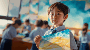 木製の机の上で、大きな紙に自由に絵を描く日本人の子ども。周囲には色鉛筆やスケッチブック。午後の日差しが窓から差し込み、穏やかな雰囲気。柔らかいパステルカラー、創造性と想像力に焦点を当てた構図。 サイズ:728 × 408 […]