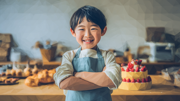 ケーキなどのお菓子作りを楽しんでいる男の子の水彩ポリゴン
