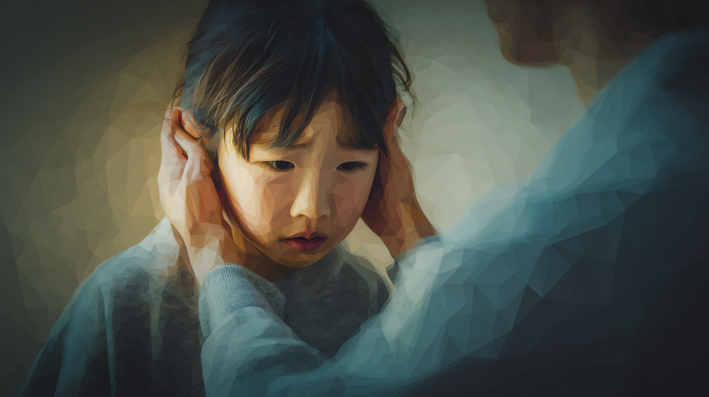 パニックサインに陥った子どもとそれを落ち着かせる大人の水彩ポリゴン