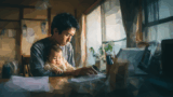 育児しながらリモートワークで働く父親の水彩ポリゴン