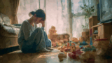 育児ストレスで限界になり泣き出す様子の水彩ポリゴン
