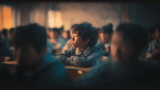 学習や日常場面での困難さと心理的負担を、水彩ポリゴンで穏やかに表現しています。