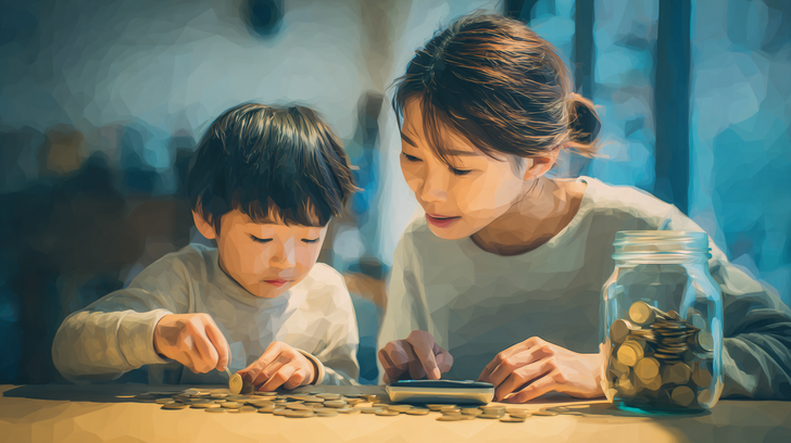 子どもが親と一緒に貯金と支出のバランスを計算し、計画的にお金を使う方法を学ぶ場面。