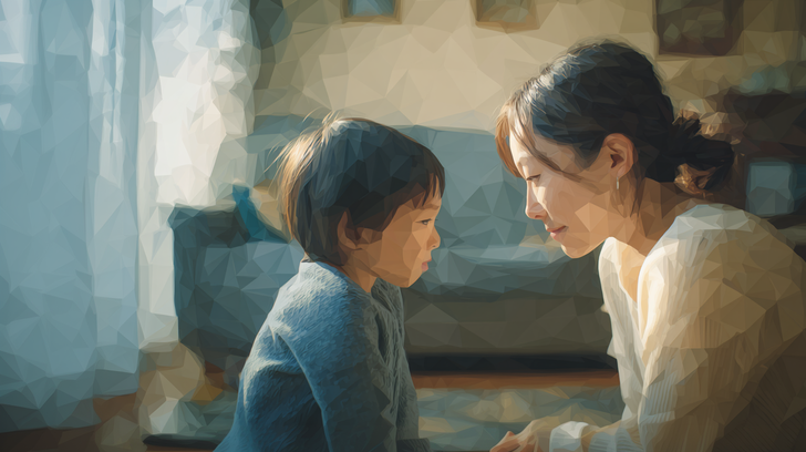 目を合わせないASDの子どもに優しく微笑みかける母親の水彩ポリゴン