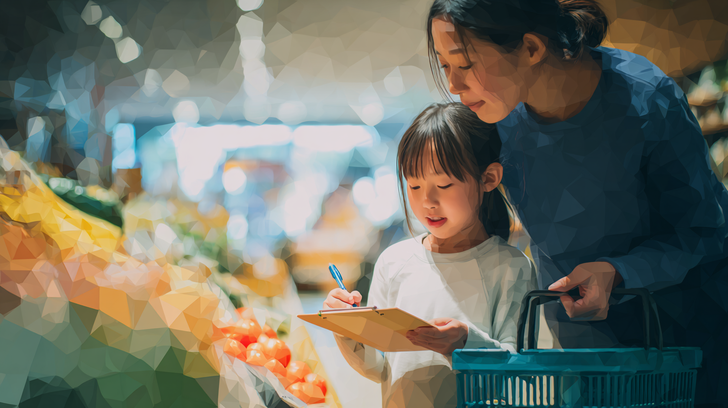 買い物を通じて家計の優先順位を学ぶ子どもの水彩ポリゴン