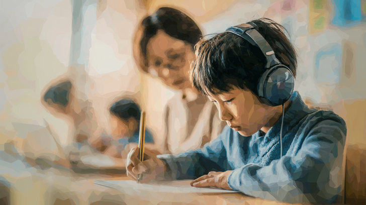 ASD児童がヘッドホンを着けて音を遮断している水彩ポリゴン