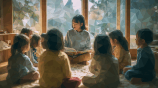 保育士が絵本の読み聞かせをしている水彩ポリゴン