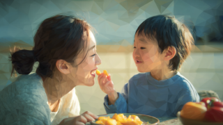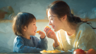 新着の水彩ポリゴン画像 ダイニングで母親が子どもにおやつを食べさせている優しさ溢れる水彩ポリゴン