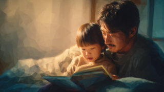 日本人の父親が子どもに絵本を読み聞かせている様子。子どもの集中した表情と父親の穏やかな微笑みが伝わります。サイズ:728 × 408px解像度:72ppi生 成:Midjourney(Pro Plan)関連語:親子、育児、父親、子ども、日本...