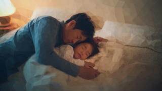 新着の水彩ポリゴン画像 就寝前に寝室で絵本を読む父と子の水彩ポリゴン