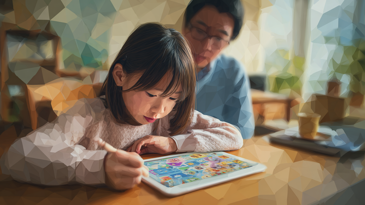 LDの女の子が学習アプリで勉強している水彩ポリゴン