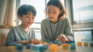 ASDの子どもが積み木で遊んでいる水彩ポリゴン